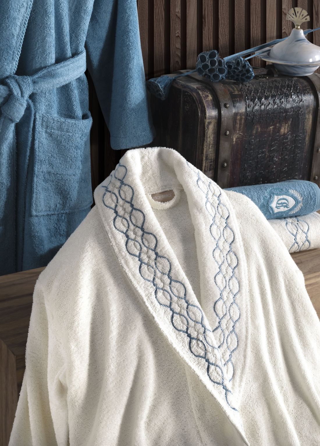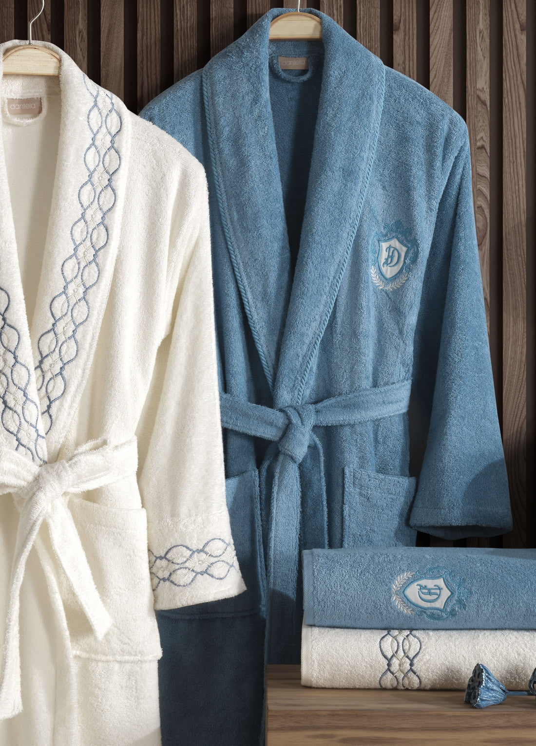 * %60 Bambu %40 Pamuk İpliğinden Üretilmiştir. * Yüksek su emiciliğine sahip bir üründür ve yıkama sonrası kumaşta sertleşme problemi yaşanmamaktadır. * Bambu İpliği özünde antibakteriyal özellik taşımaktadır ve ürünümüz antibakteriyal özelliktedir. * Toplam 6 parçadan oluşmaktadır. Üzerinde modele göre değişen özel tasarım nakış ve dantel işleme mevcut olup uzun yıllar kullanılabilecek bir üründür. Özel tasarım kutusu ile gönderilmektedir. *1 Adet Bay Bornoz (Large) * 1 Adet Bayan Bornoz (Medium) *2 Adet Baş Havlusu (50x90cm) *2 Adet Banyo Havlusu(85x150cm)