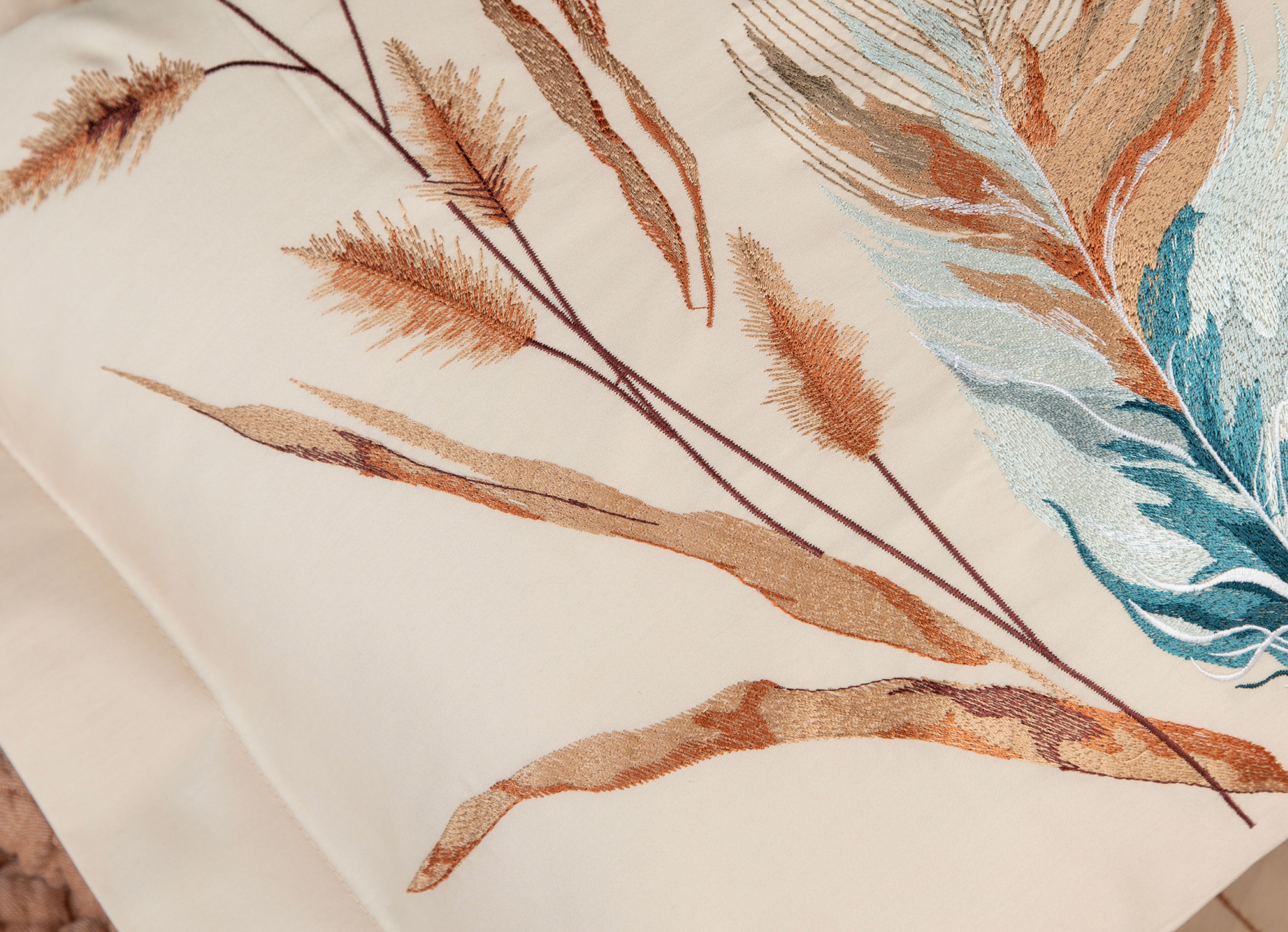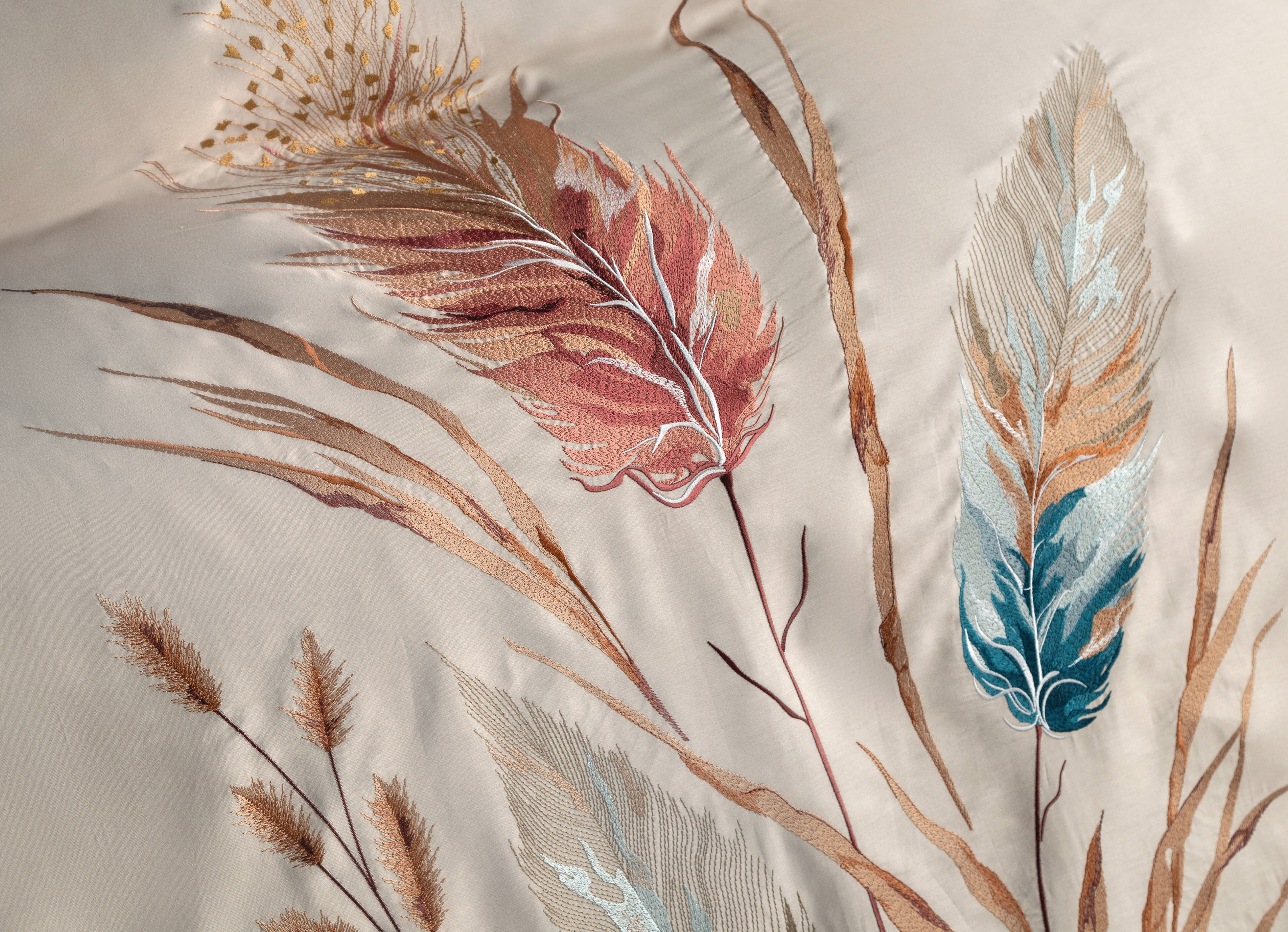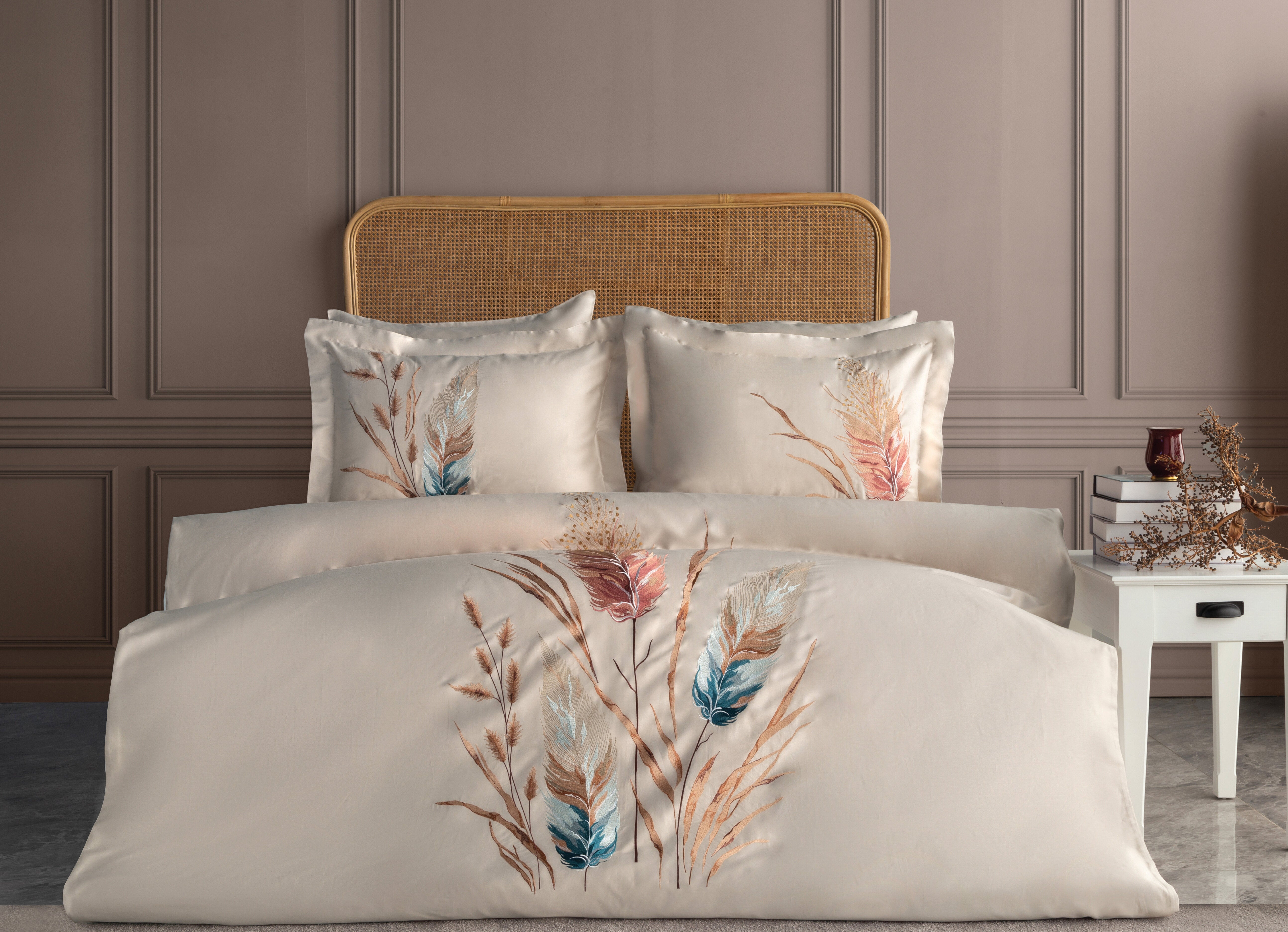 Yatak odanıza sıcak ve huzurlu bir hava katın! Doğanın ilham verdiği zarif ot ve tüy desenleriyle tasarlanmış bu bej renkli nevresim takımı, saten dokusuyla hem şıklığı hem de konforu bir arada sunuyor. Yumuşak dokusuyla cildinize dost, estetik görünümüyle göz alıcı bir tasarıma sahiptir.