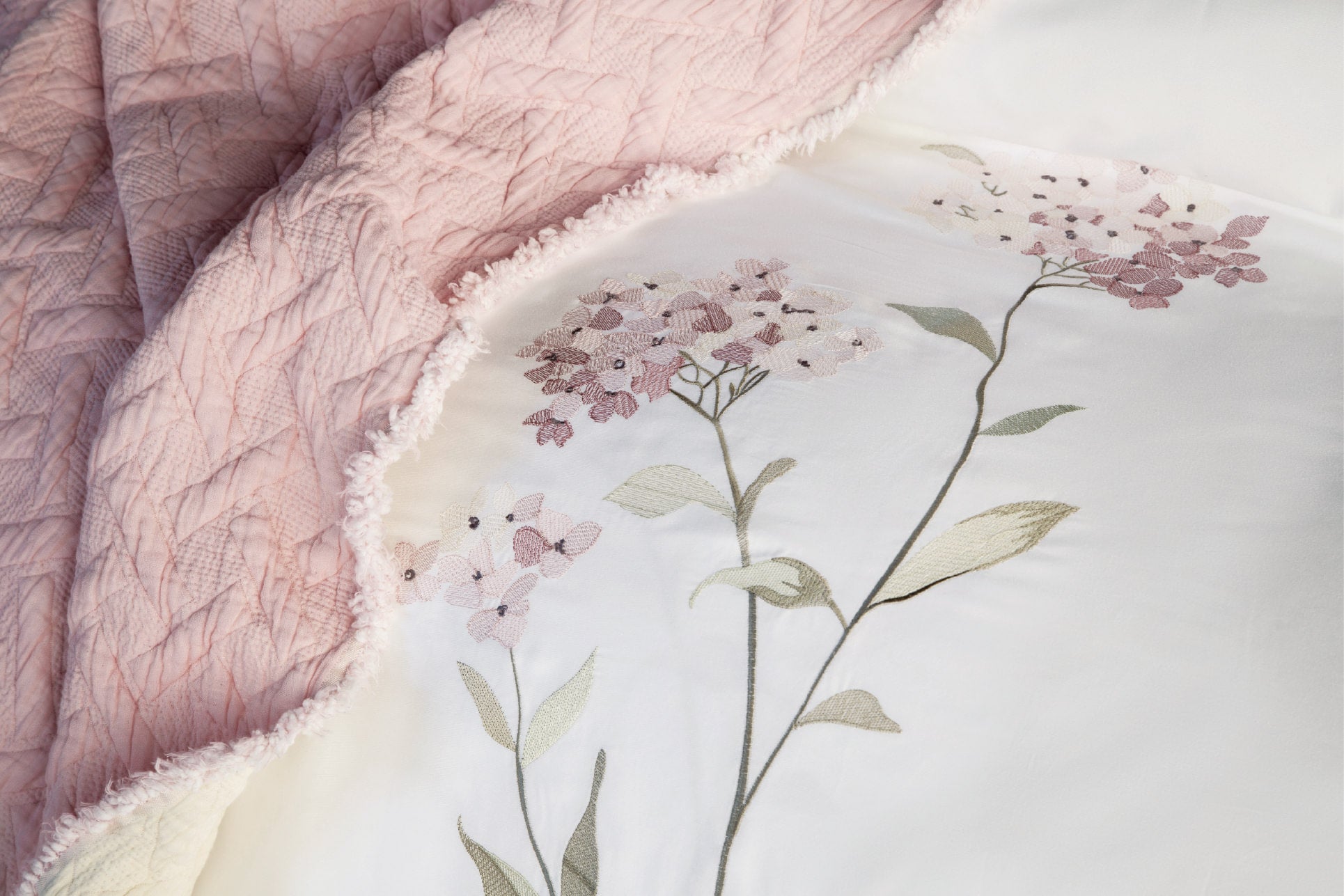 Şıklığı ve konforu bir arada sunan bu özel tasarım, zarif ortanca çiçekleriyle göz alırken, %100 pamuk kumaşı sayesinde cildinizde ipeksi bir yumuşaklık bırakır. Nefes alan dokusu, dört mevsim kullanım imkânı sunar; terletmez, üşütmez, sadece rahat bir uyku sunar.