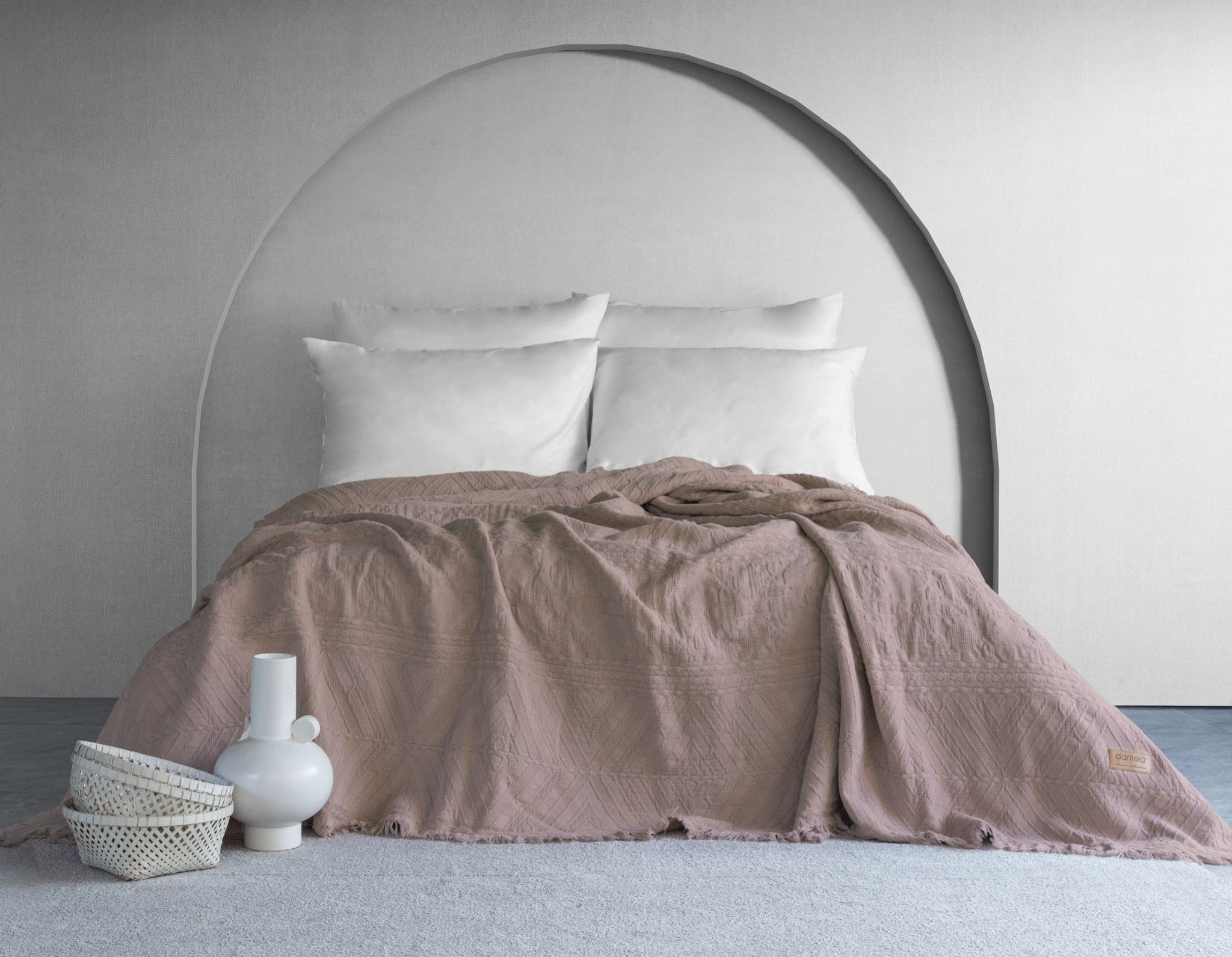 Zarif ve romantik bir atmosfer için… Pudra Lumia Etnik Desen Yatak Örtüsü, pastel tonuyla sıcaklık ve huzur sunar. %100 pamuklu kumaşı cilt dostudur; etnik dokusu ise sade dekorasyonlara özgün bir karakter katar.