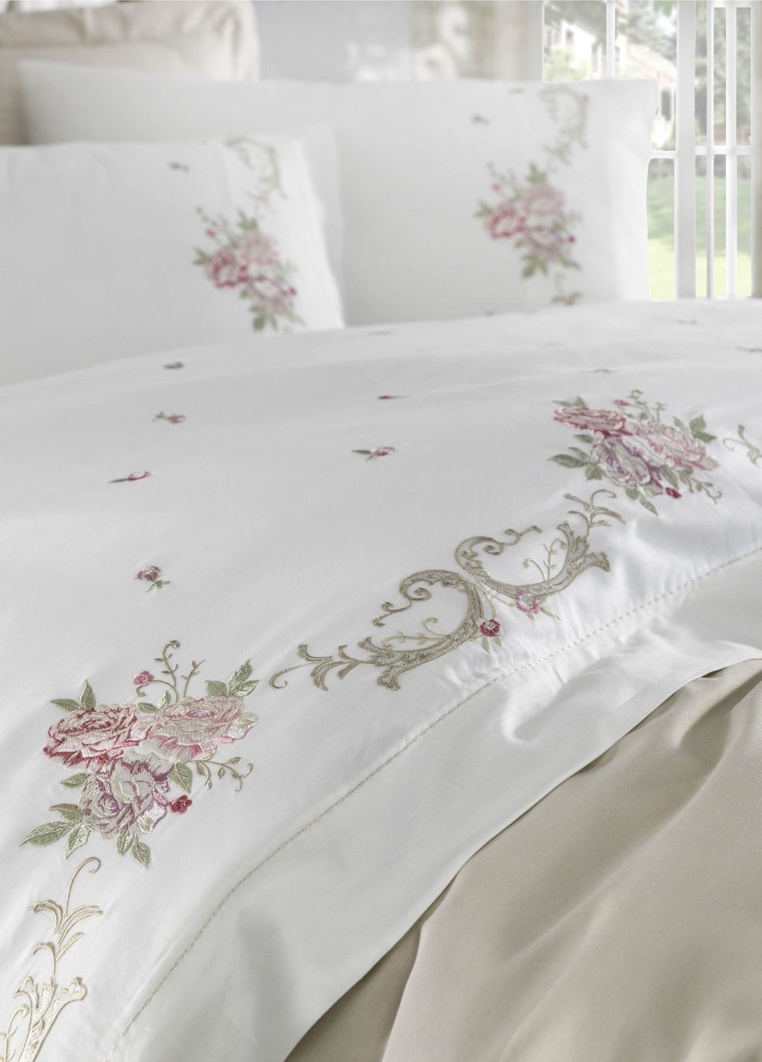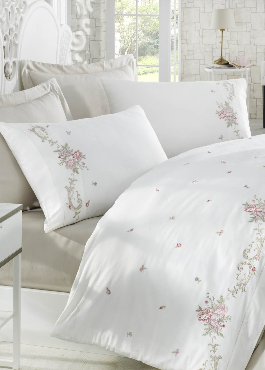 Nakışlı Pamuk Saten Beyaz Nevresim Takımı - Rosenna