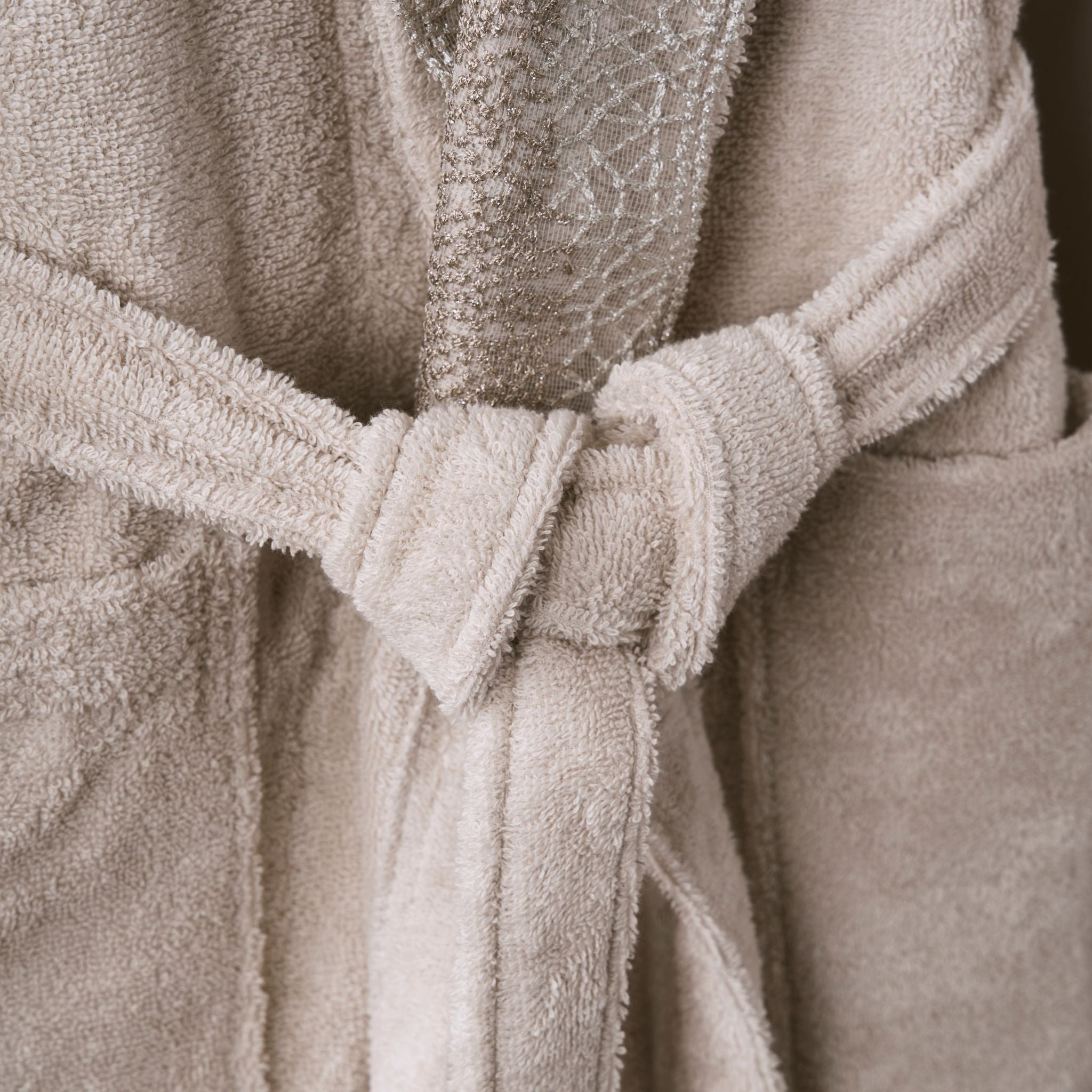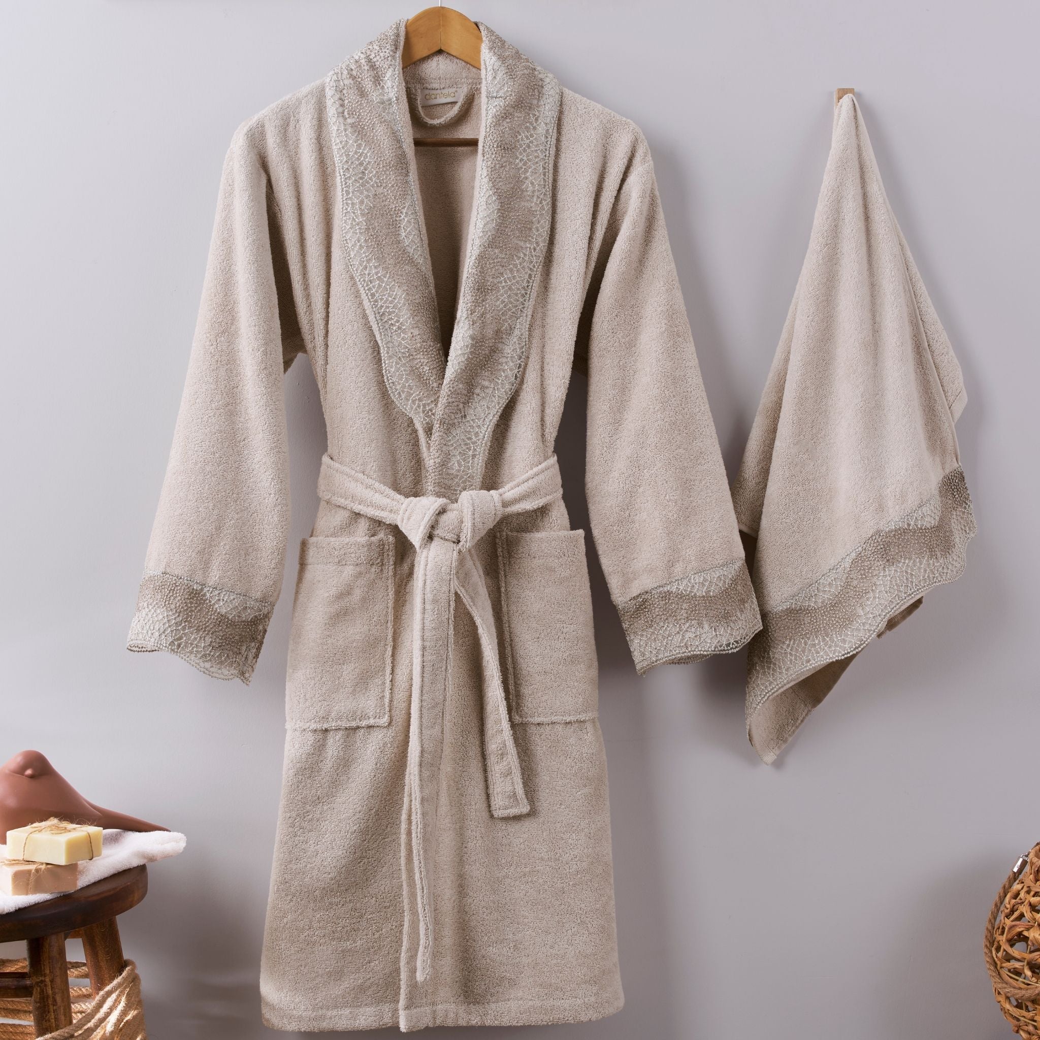 Şıklık ve konforu bir araya getiren bu zarif set, günlük kullanımınıza yumuşaklık ve estetik katmak için tasarlandı. Doğal bej rengi ve ince güpür detaylarıyla banyonuza sade bir şıklık sunar.