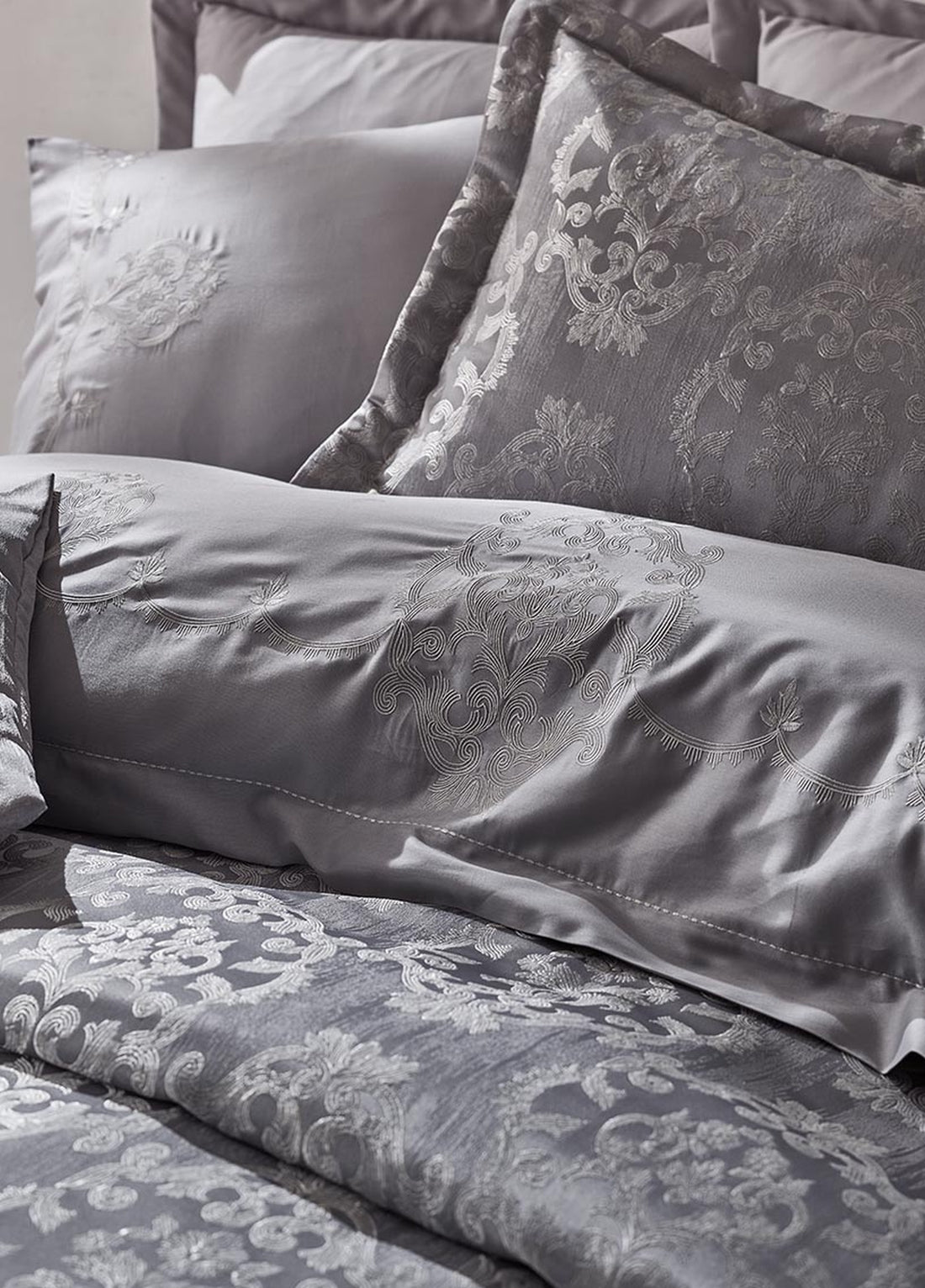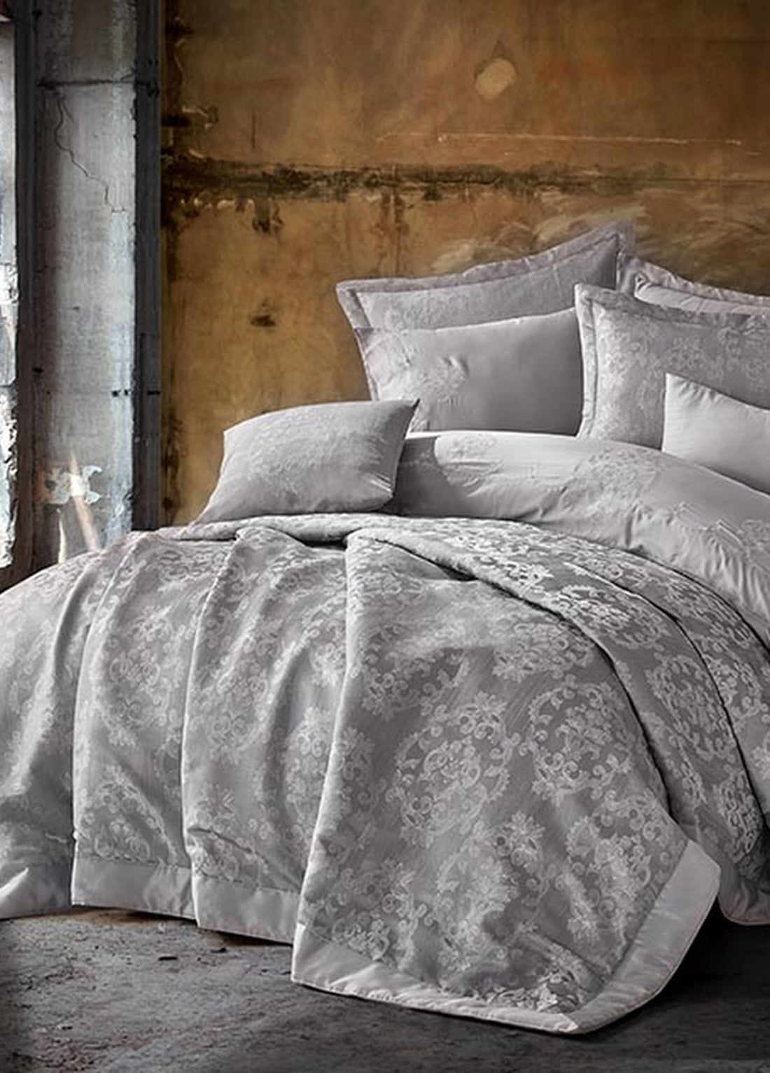 Серый комплект пододеяльника и покрывала из жаккардового волокна с вышивкой - Nilda